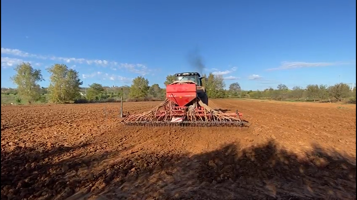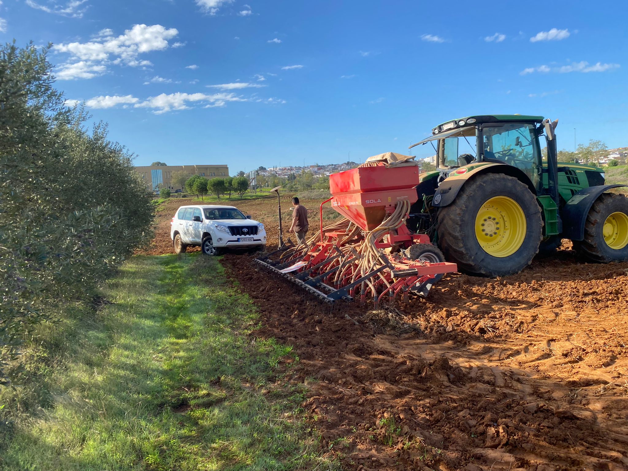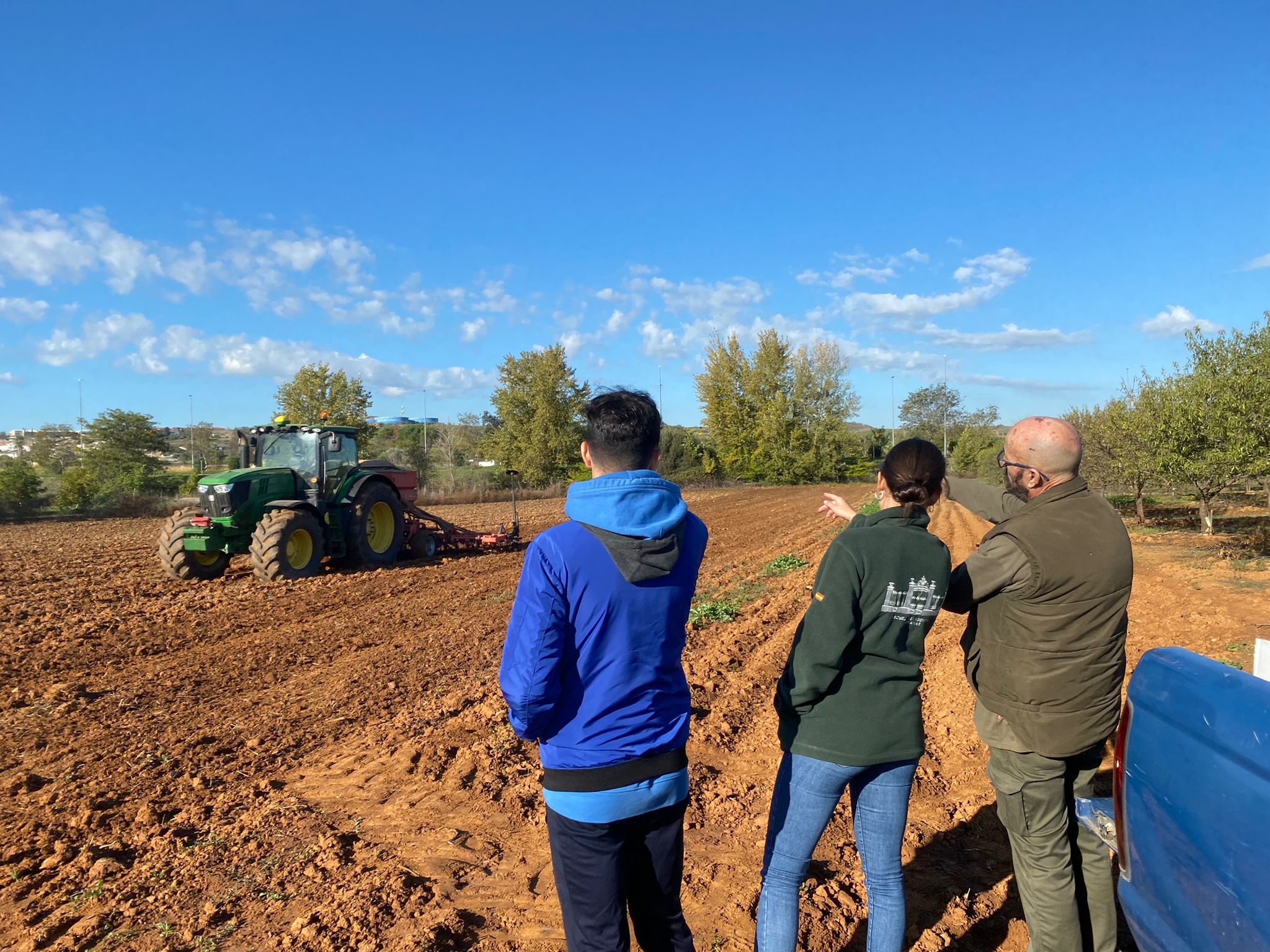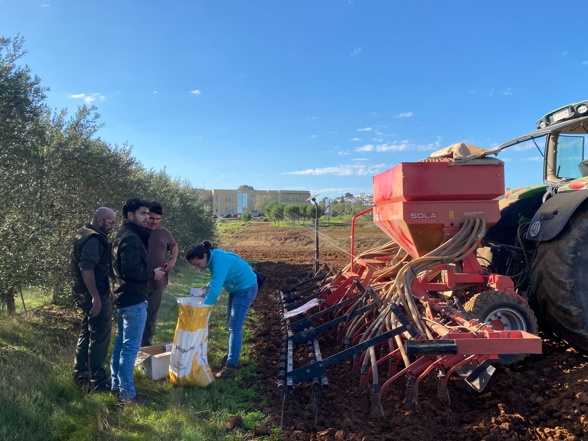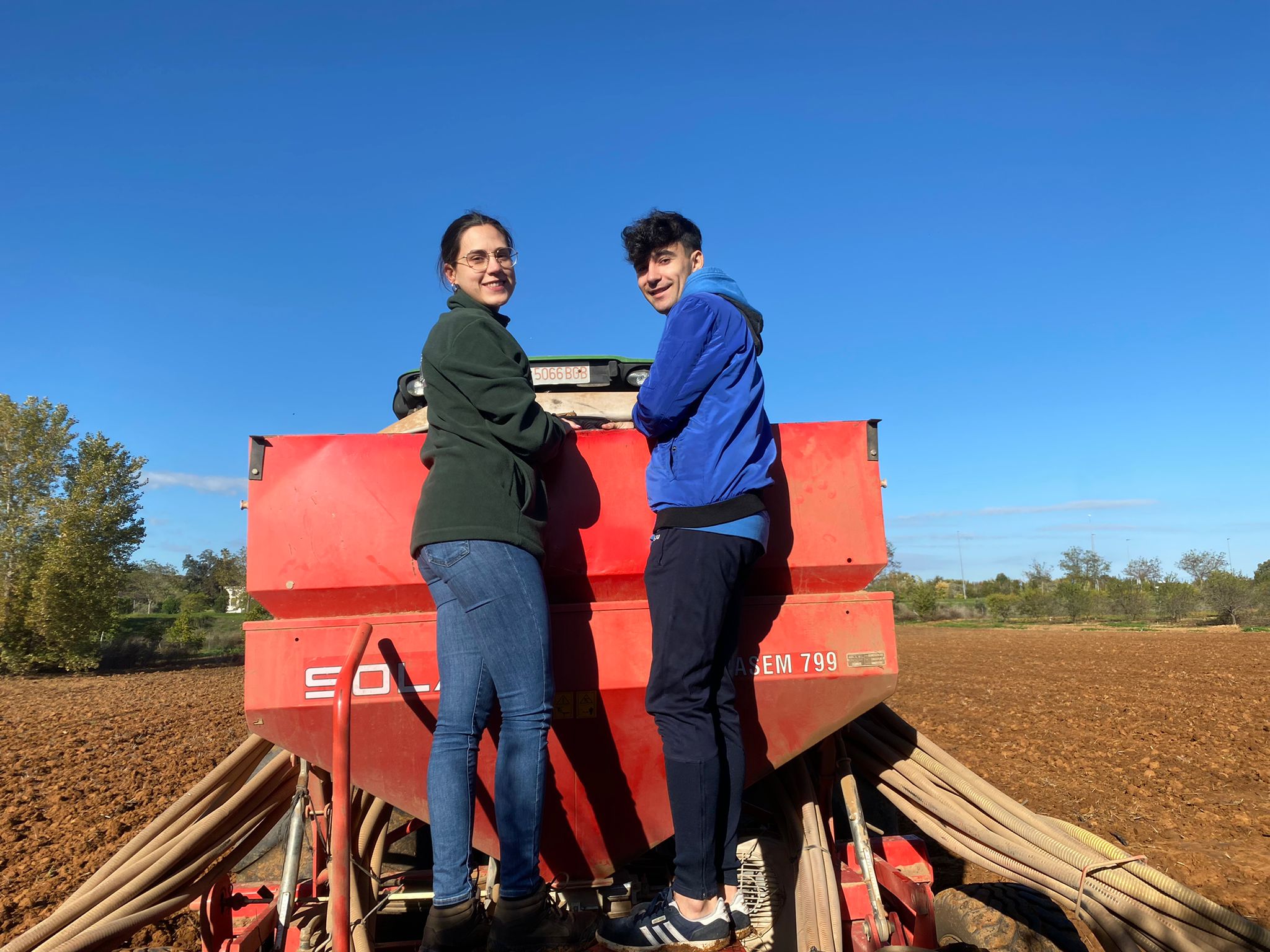 Alumnos de 3º curso del grado en Ingeniería Hortofrutícola y Jardinería y los profesores Gonzalo Esteban y Angel Albarrán aparecen en las imágenes combinando los contenidos teóricos con la práctica real en campo. Siembra de distintos cultivos en los campos de prácticas de la Escuela de Ingenierías Agrarias de Badajoz efectuada con sembradora SOLA Neumasem 799 neumática y tractor John Deere 190 CV.
