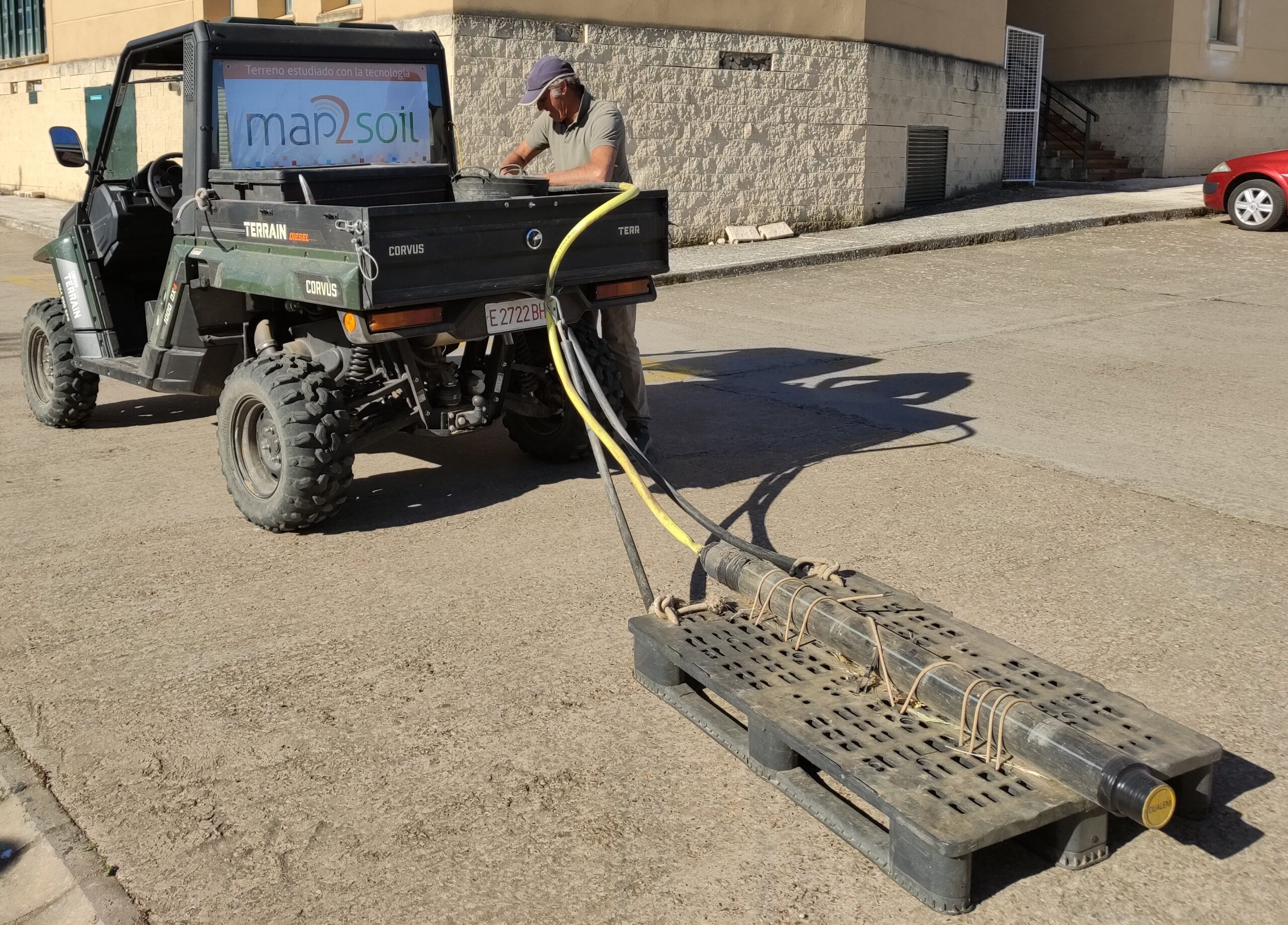 La conductividad eléctrica (CE) es la medida de la capacidad de un material (suelo) para dejar pasar la corriente eléctrica a través de él, y se han desarrollado una serie de sensores para medirla directamente sobre el terreno (conductividad eléctrica aparente, CEa). El sensor DUALEM, instalado sobre ese patinete, se desliza superficialmente sobre el terreno y basa su medición del campo magnético en el análisis de la señal entre sus bobinas emisoras y receptoras.